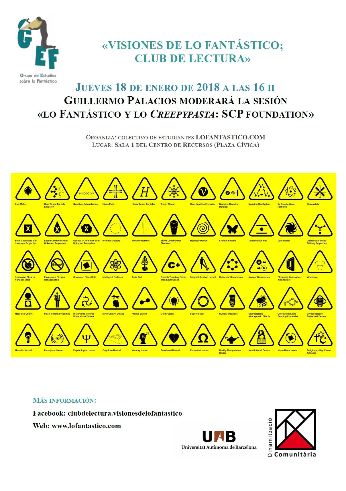 El passat dijous 18 de gener es va realitzar un d’aquests debats temàtics al centre de Recursos per a Col·lectius. La sessió dirigida per Guillermo Palacios va generar un interessant debat sobre la realitat i la ficció partint del gènere fantàstic Creepypasta, enfocat a l’experiència de la The SCP Foundation.