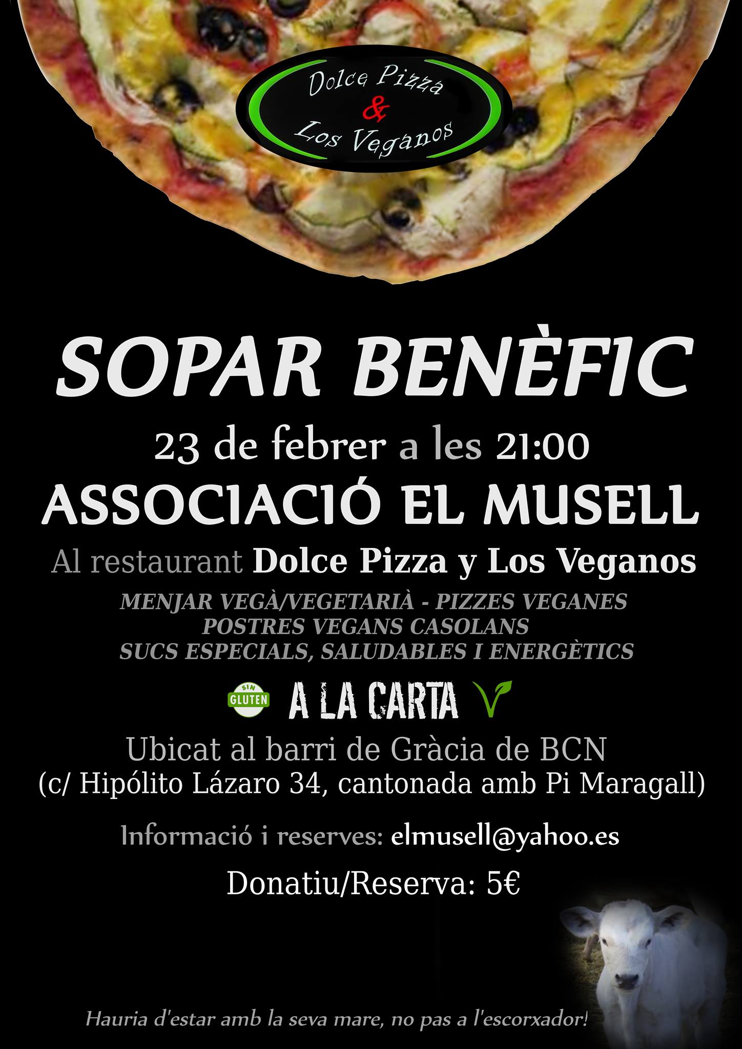 El sopar es realitzarà al Restaurant Dolce Pizza y Los Veganos ubicat al barri de Gràcia de BCN. Per poder assistir s’ha de reservar assistència enviant un correu a elmusell@yahoo.es i presentant un donatiu de 5 €.