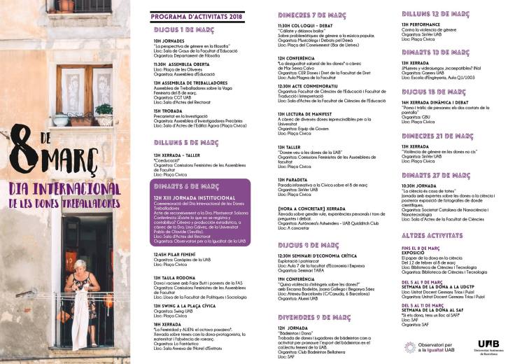 Durant les pròximes setmanes fins al dia 27 de març, el Campus Universitari de la UAB s’omplirà de tot un seguit d’activitats entorn al 8 de març, dia Internacional de la Dona Treballadora. Les activitats han estat proposades per alguns dels col·lectius inscrits a elDirectori i altres entitats de la comunitat universitària.