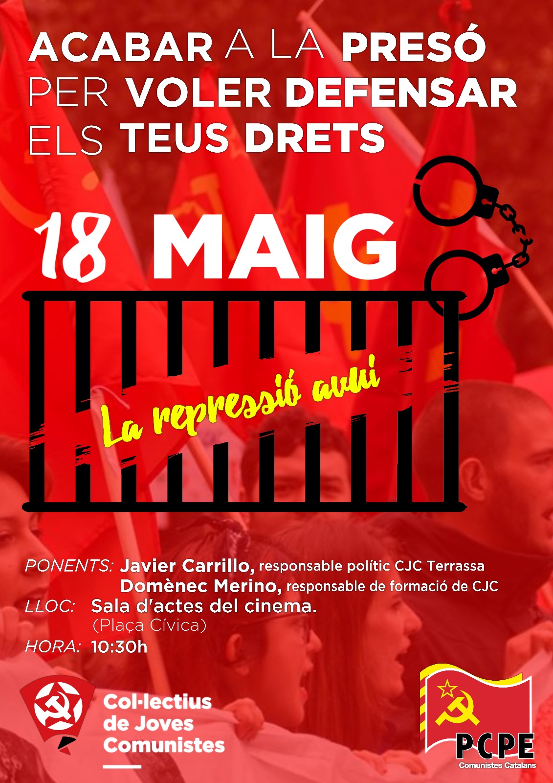 Demà divendres dia 18 de maig, el Col·lectiu de Joves Comunistes (CJC) ha organitzat una xerrada en la qual es tractarà la repressió actual i l’efecte que aquesta té enfront de la llibertat d’expressió i la capacitat de defensar els drets dels treballadors. L’acte es presenta amb el següent títol: “Acabar a la presó per voler defensar els teus drets”.
