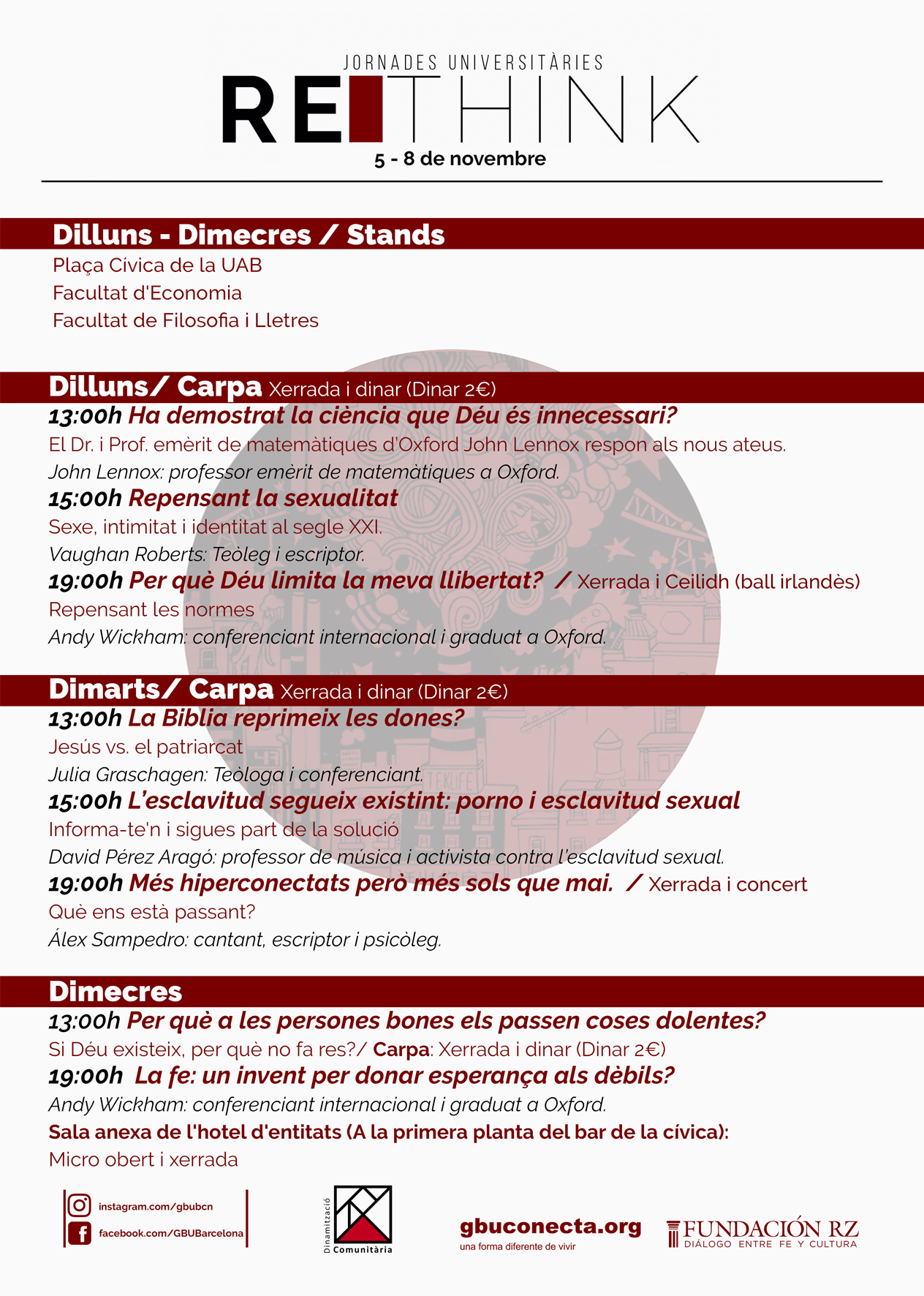 Del dia 5 al 8 de novembre, el col·lectiu GBU amb col·laboració de la Fundació RZ, han organitzat les jornades universitàries “Re Think” amb diverses xerrades, debats i musica en directe que tindran lloc a la Plaça Cívica de la UAB. La finalitat d’aquestes és acostar als joves temes teològics des d’un enfocament diferent i actualitzat d’acord amb els interessos reals d’aquest públic.