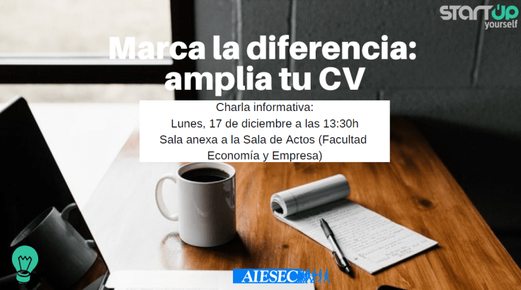 Aquest dilluns 17 de desembre, l’associació AIESEC realitza una xerrada en la qual t’explicaran com pots ampliar el teu CV fent pràctiques a l’estranger. La conferència tindrà lloc a la Sala Annexa, a la Sala d’Actes de la Facultat d’Economia i empresa.