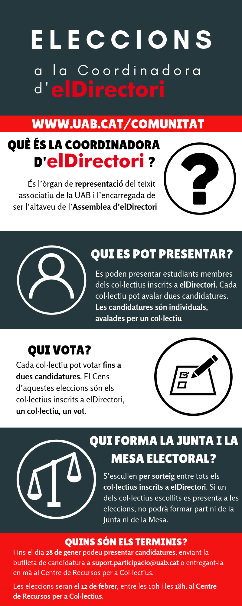 Fins el 28 de gener, les persones que participen dels col·lectius inscrits a elDirectori poden presentar la seva candidatura per a les eleccions a la Coordinadora d’elDirectori. Per a poder-se presentar, cal l’aval d’un dels col·lectius inscrits a elDirectori. Cadascun dels col·lectius pot avalar, com a màxim, dues candidatures individuals.