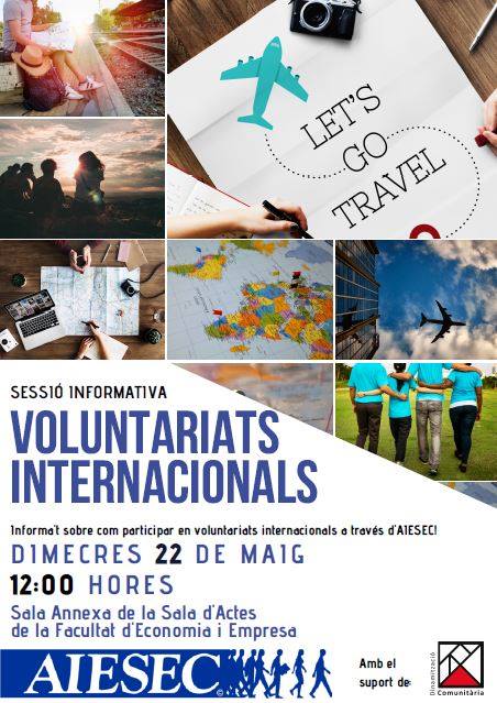 L’Associació AIESEC organitza una sessió per a informar tota la comunitat dels seus programes de voluntariats i pràctiques internacionals, el proper dimecres 22 de maig a les 12h, a la Sala Annexa de la Sala d’Actes de la Facultat d’Economia i Empresa.
