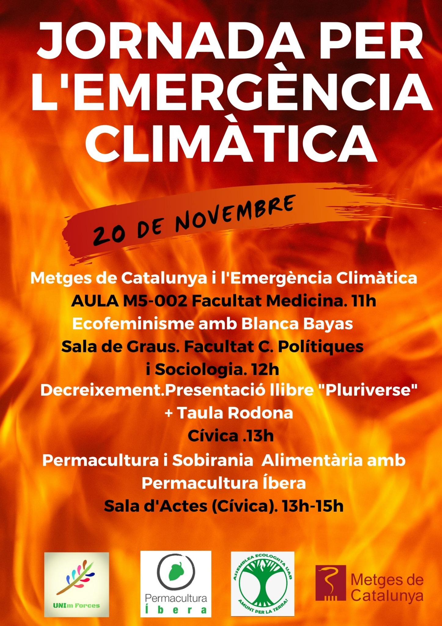 La jornada començarà a les 11 del matí amb una xerrada on el doctor Josep Maria Puig, de Metges de Catalunya, parlarà, a la Facultat de Medicina, sobre els problemes de salut derivats de la crisis climàtica. Més tard, a les 12 h, Blanca Bayas, membre de la xarxa per la Sobirania Energètica i del Observatori del Deute en la Globalització, donarà veu a l’ecofeminisme a la Facultat de Ciències Polítiques i Sociologia.