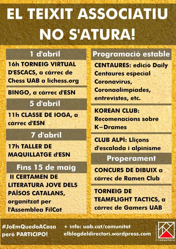 El pròxim 1 d’abril, Chess UAB organitza, per la seva part, un torneig virtual d’escacs a través de la plataforma lichess.org, on podreu accedir fent servir la clau “ChessUAB”. L’Assemblea FilCat ha ampliat el termini fins el 15 de maig per a presentar les obres al II Certamen de literatura jove dels Països Catalans i ESN UAB l’1 d’abril farà un bingo i el dia 7 d’abril a les 17h, un taller de maquillatge.