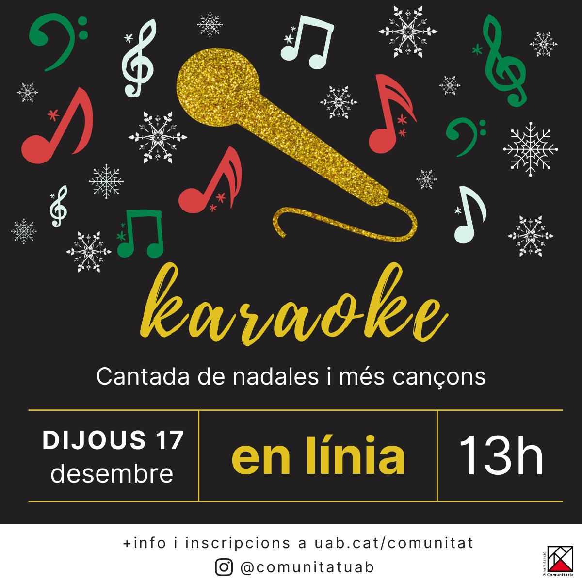Per a acomiadar aquest estrany primer semestre farem un karaoke dirigit a tota la comunitat universitària, però especialment al teixit associatiu de la UAB, el proper dijous 17 de desembre a les 13h. Comptarem amb la participació d’estudiants internacionals que ens proposaran cançons típiques de nadal dels seus països i amb membres de la Unitat de Dinamització Comunitària que també s’animaran a cantar.