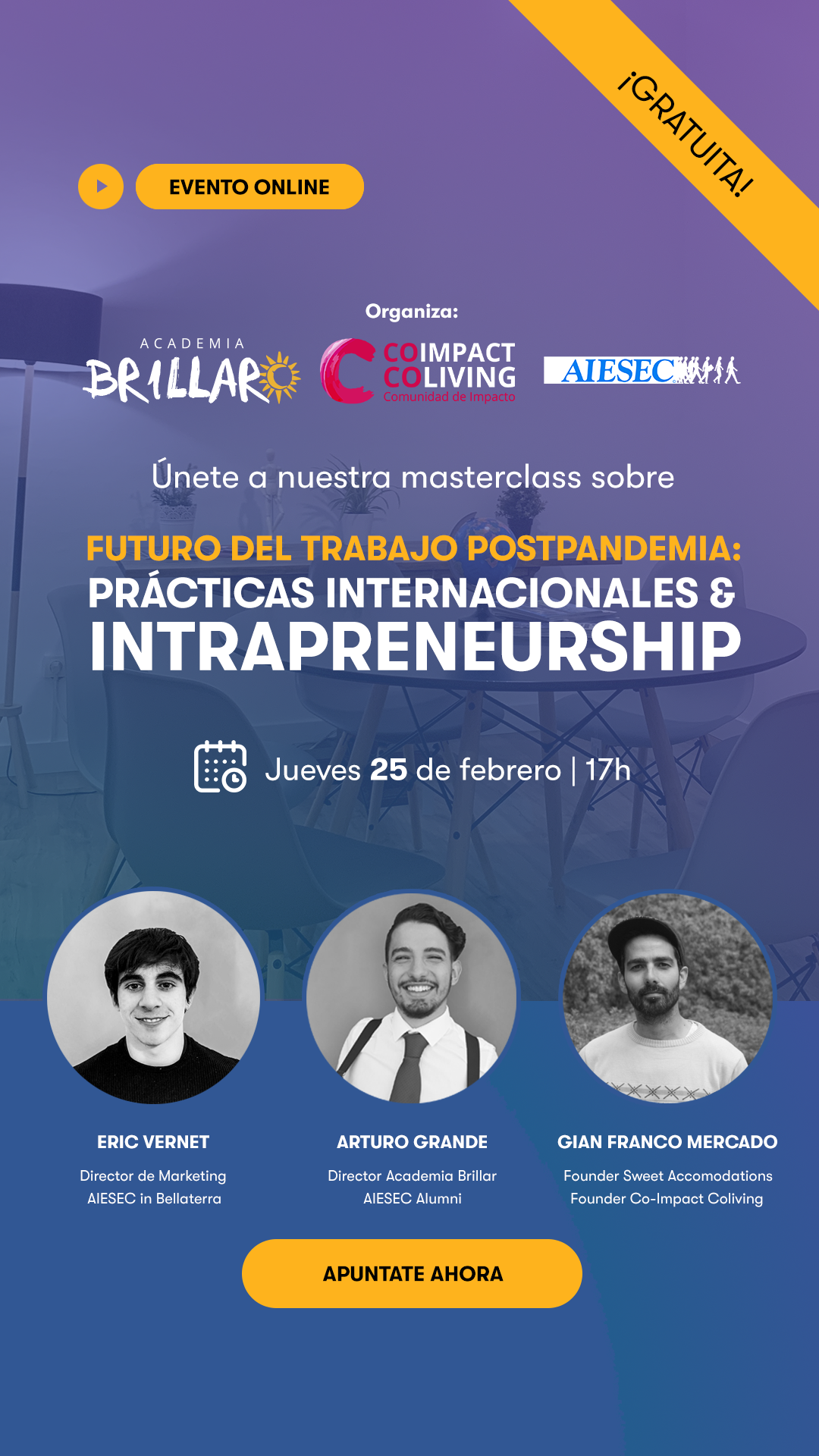 AIESEC organitza el proper dijous 25 de febrer a les 17 h una masterclass gratuïta en línia sota el títol Futuro del trabajo post pandemia: Prácticas internacionales & intrapreneurship. Està organitzada juntament amb Co Impact Co living i Academia Brillar.