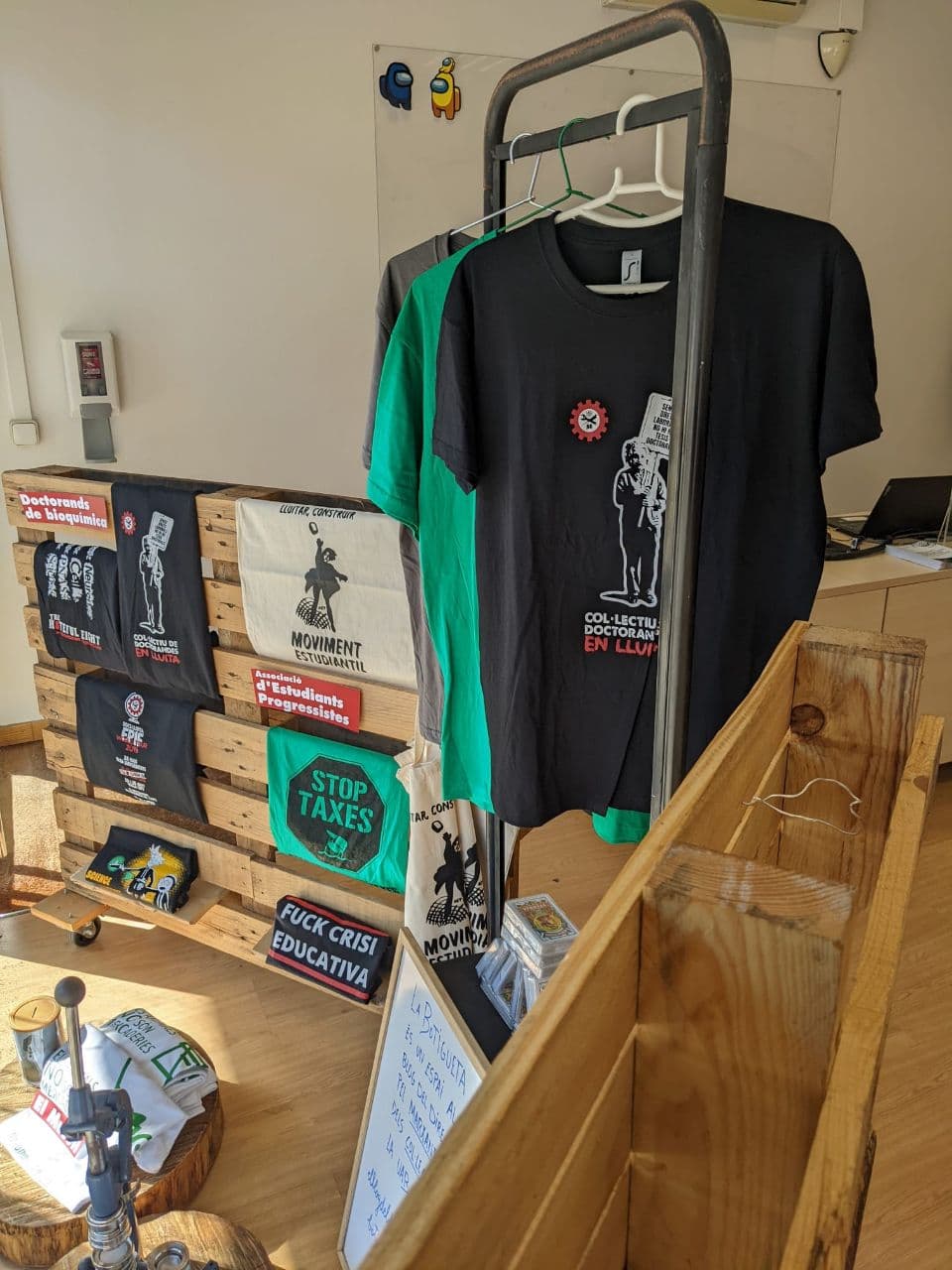 Alguns dels articles que hi havia a la Botigueta fins ara eren les samarretes de Doctorands Bioquímica-Doctorands en Lluita, així com les bosses i també samarretes d’AEP amb missatges reivindicatius.