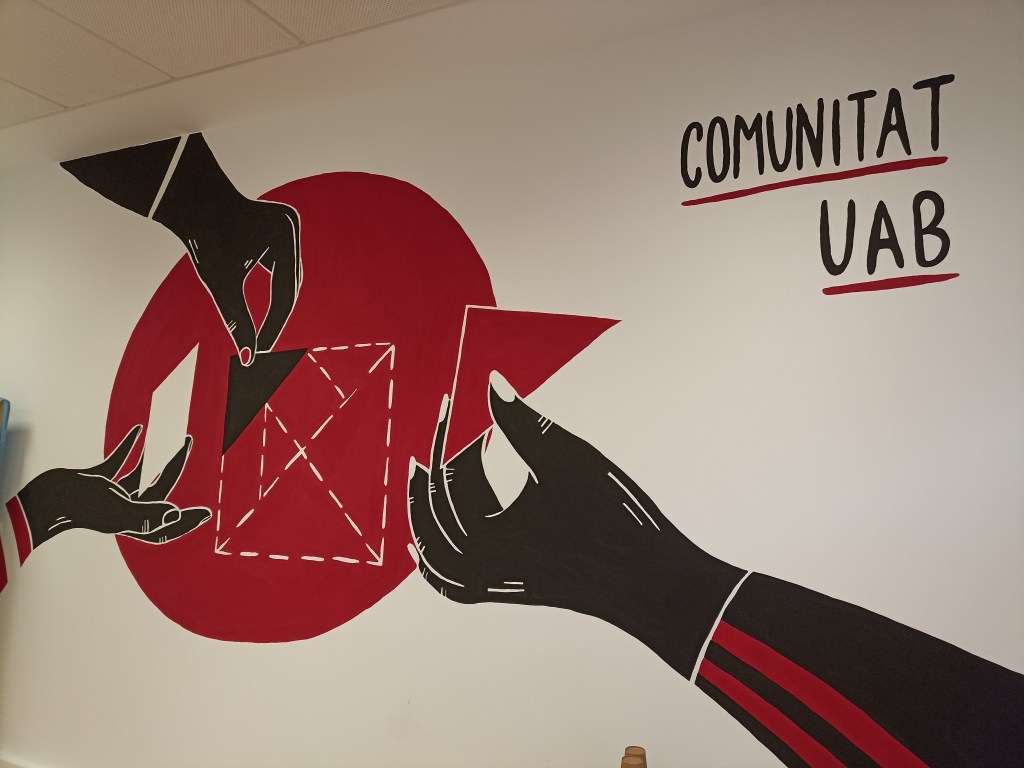 L’artista Clara Corax ha construit aquest disseny a partir del logotip de Dinamització Comunitària i s’ha basat en la idea de comunitat i de la xarxa associativa a la UAB.