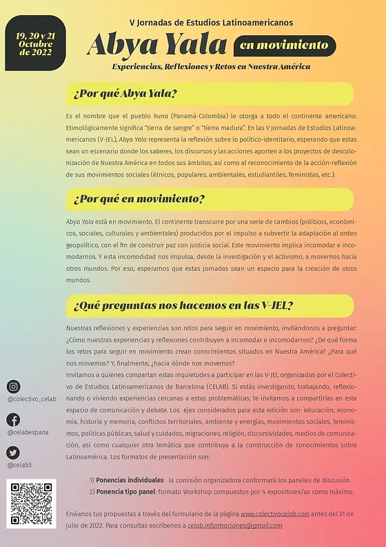 El dijous 20 d’octubre se succeïran pel matí les taules rodones “Historias cruzadas: lo no contado de Nuestra América” i “Migración, conflictos y trayectorias migratorias”, seguides d’una presentació de llibre i de la revista Socializar conocimientos de CELAB. Després de dinar podrem escoltar altres investigacions sobre construcció d’identitats a l’espai públic, sobre pobles indígenes, o sobre reconciliació col·lectiva en contextos de violència, entre d’altres moltes qüestions.