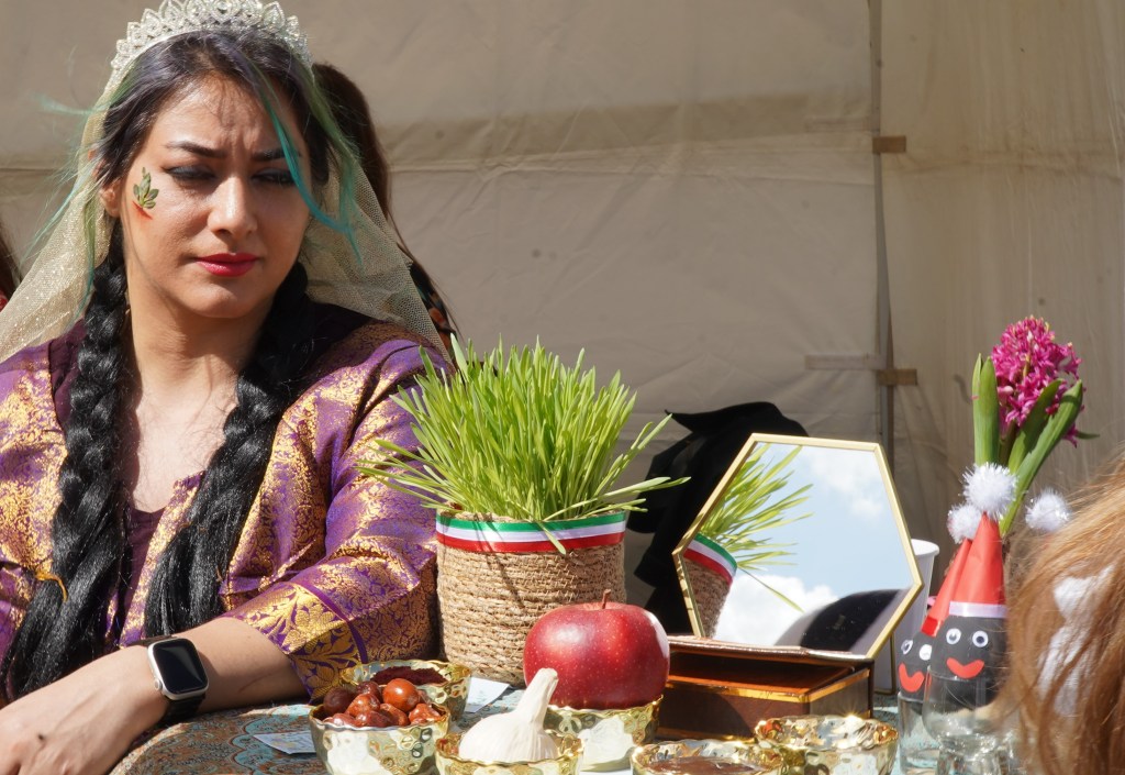 Imatge enfocant l’espai que tenia el col·lectiu durant la Fira asiàtica 2023. Una de les noies, la que es veu en primer pla, porta vestimenta tradicional iraniana.