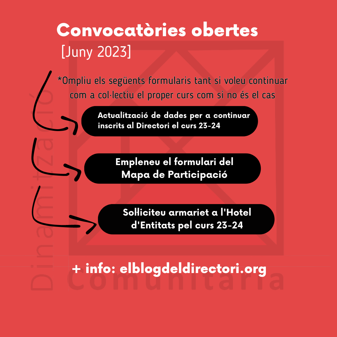 Alhora, els col·lectius que SÍ que voleu continuar al Directori i també voleu demanar un armariet a l’Hotel d’Entitats (bé per mantenir el que teniu o per a demanar-ne un per primer cop), ompliu el següent formulari.