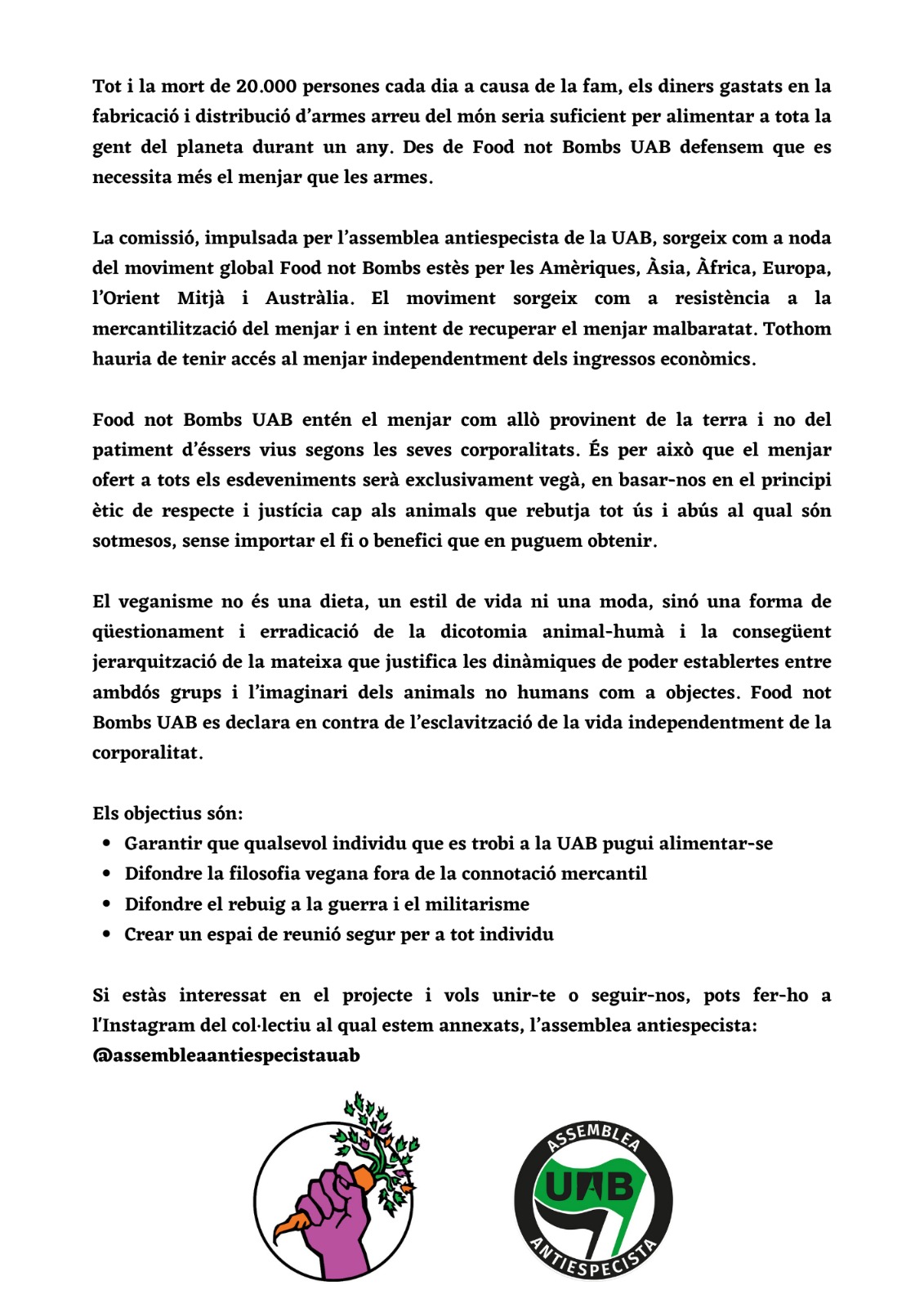 L’Assemblea Antiespecista també ha escrit un manifest antibel·licista en què plantegen com a objectius: