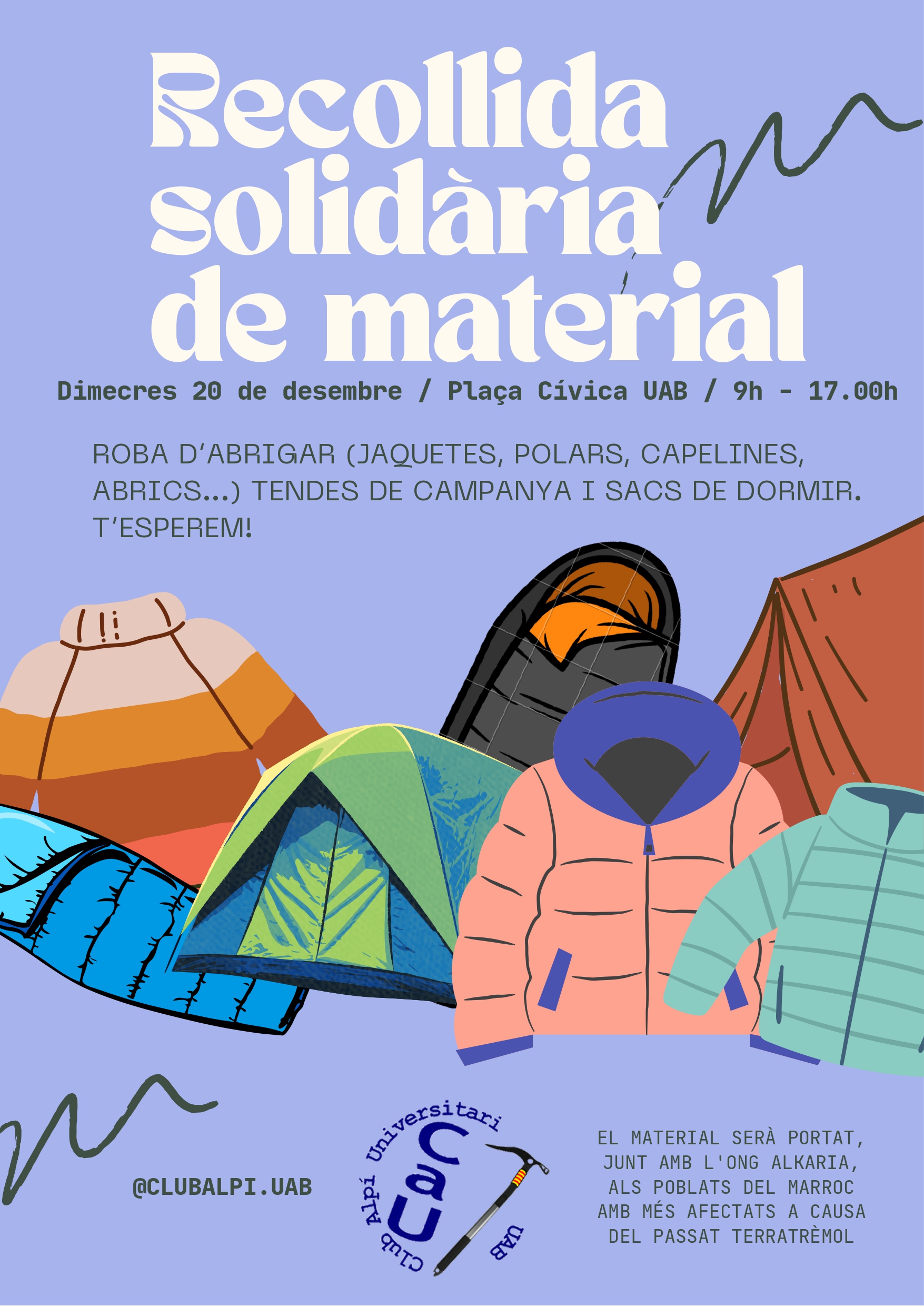 A més, el dimecres 20 de desembre, el Club Alpí Universitari, estarà recollint material a la Plaça Cívica. Necessiten: