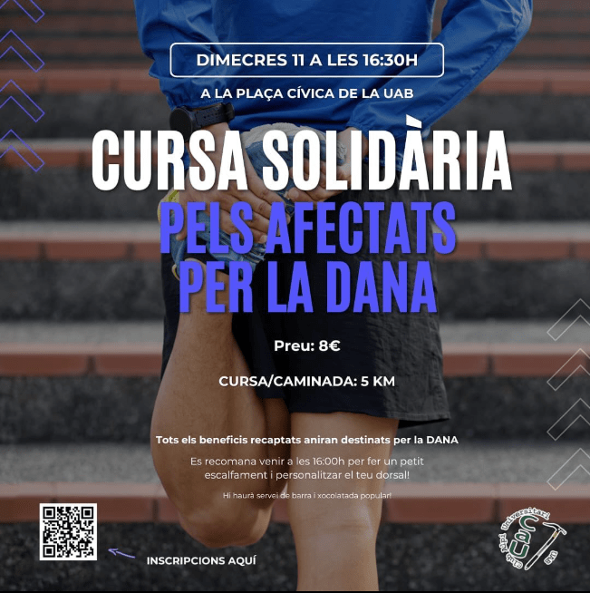 Un moment, però si no hi seré al cap de setmana, hi ha alguna activitat més en la qual pugui participar? Doncs sí. Aquest any, el Club Alpí Universitari de la UAB ens oferirà una cursa solidària per recaptar fons pels afectats per la DANA. A la Plaça Cívica a les 16:30 h començarà la cursa, amb 5 km per davant per escalfar de cara al cap de setmana. Si voleu més informació teniu les seves xarxes socials al següent enllaç: https://elblogdeldirectori.org/club-alpi-universitari/
