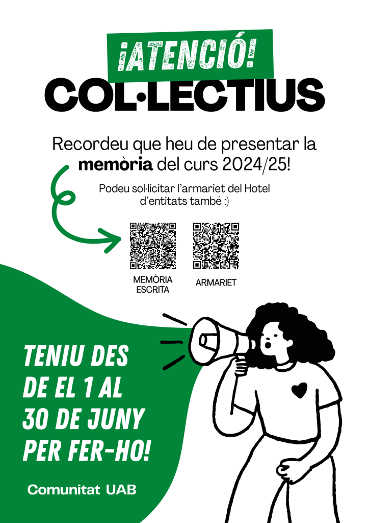 Ja podeu presentar la memòria d’activitats del curs 2024/25 del vostre col·lectiu! Aquest tràmit és imprescindible per seguir formant part de la comunitat d’entitats de la UAB. Perquè cada acció, cada activitat, cada projecte que heu fet realitat, mereix ser reconegut. I perquè presentar la memòria és clau per mantenir el vostre col·lectiu actiu dins la comunitat de la UAB i conservar els drets que us pertoquen (espais, recursos, visibilitat…).