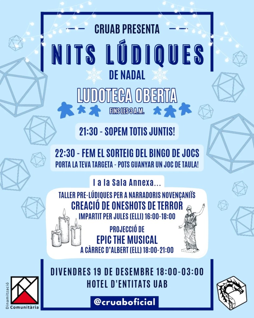 Les festes de Nadal estan al caure! I com no podria ser de cap altra manera, s’apropen també les últimes Nits Lúdiques de l’any amb el Club de Rol de la UAB!🥳❄️