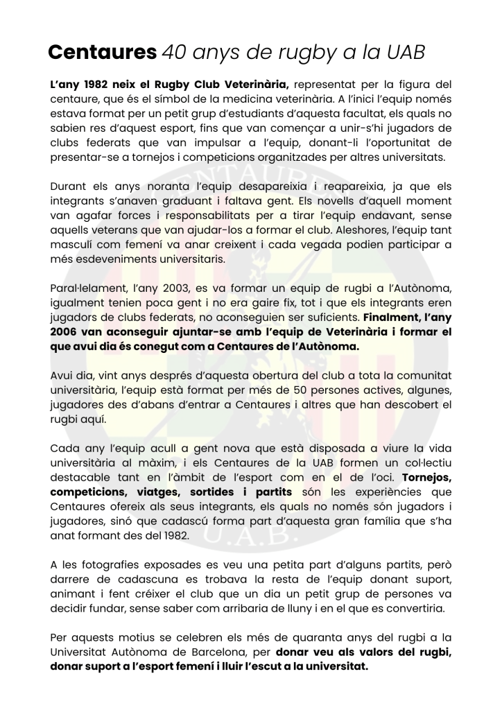 Està tothom convidat a aturar-se, observar les fotografies, llegir i conèixer la història de com va néixer Centaures i descobrir una part molt important de la història esportiva de la nostra universitat.🏉
