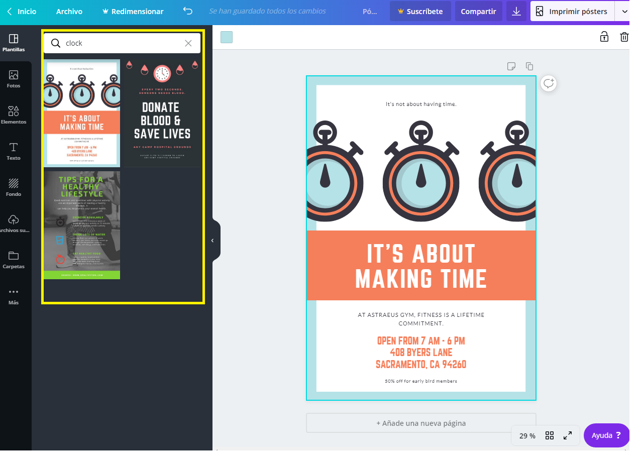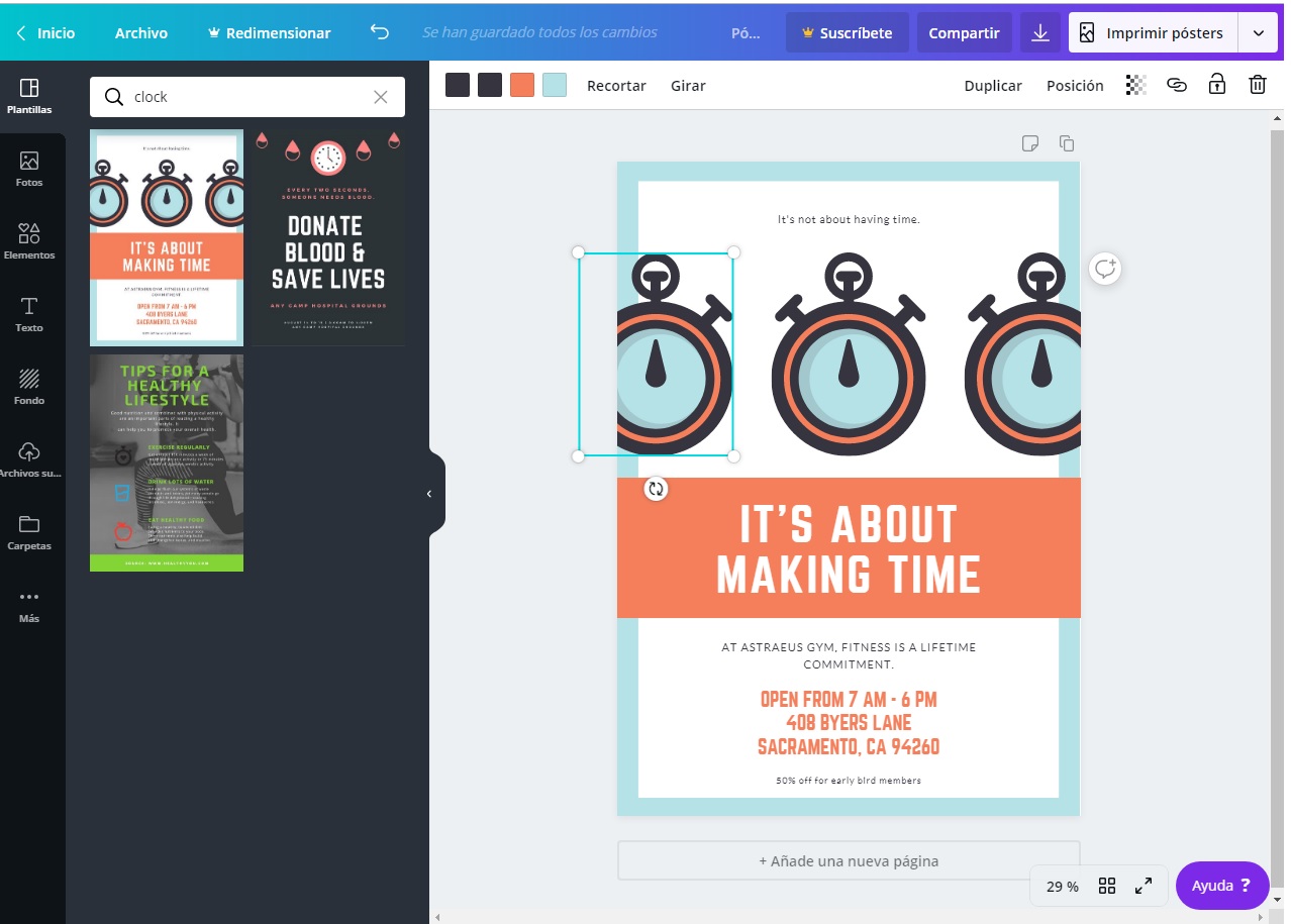 Seleccionat cadascun dels elements del cartell podem eliminar-lo o editar-lo. Per exemple, si seleccionem un dels rellotges, ens apareixen totes les opcions habilitades a la part superior de la imatge.
