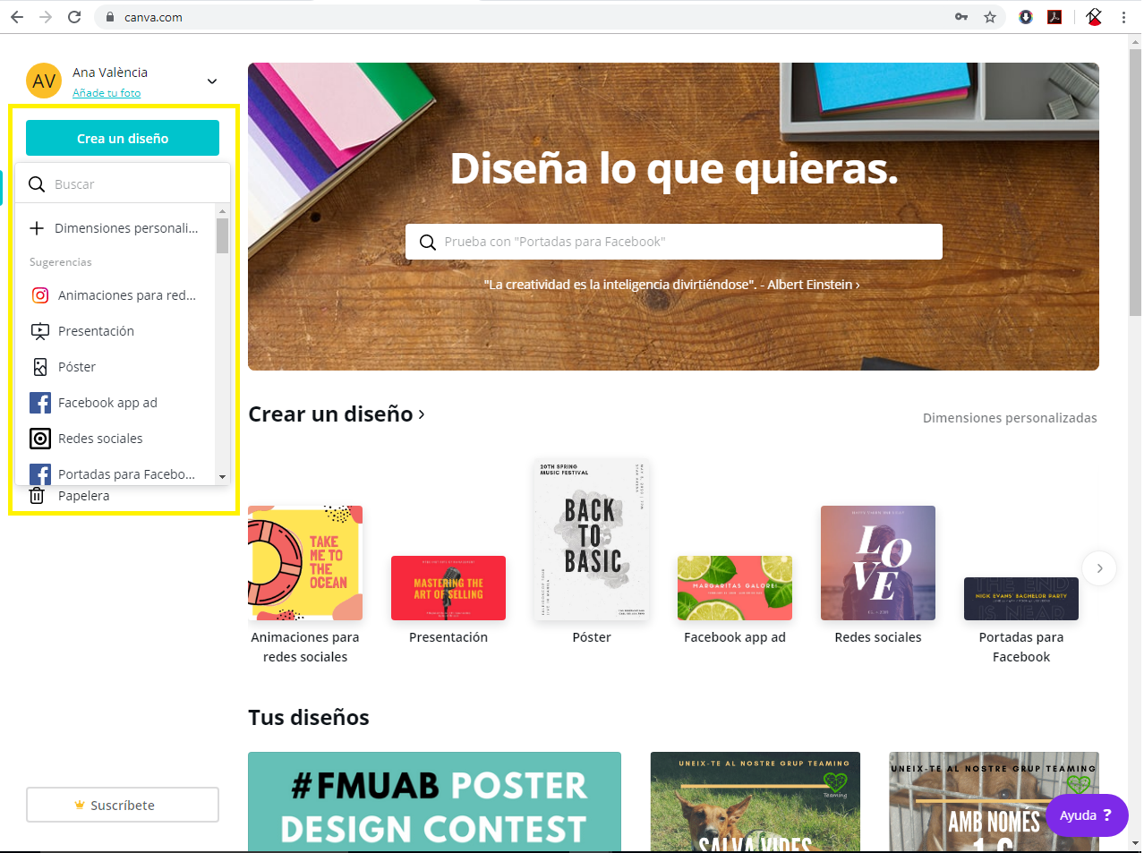 Per començar, heu de fer click a Crea un diseño, i a partir d’aquí escolliu una de les opcions que us ofereix: plantilles amb dimensions determinades o una nova amb dimensions personalitzades. (Imatge 1).