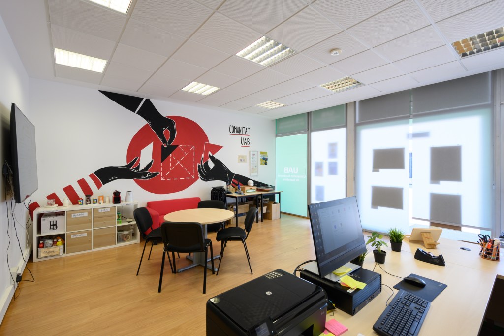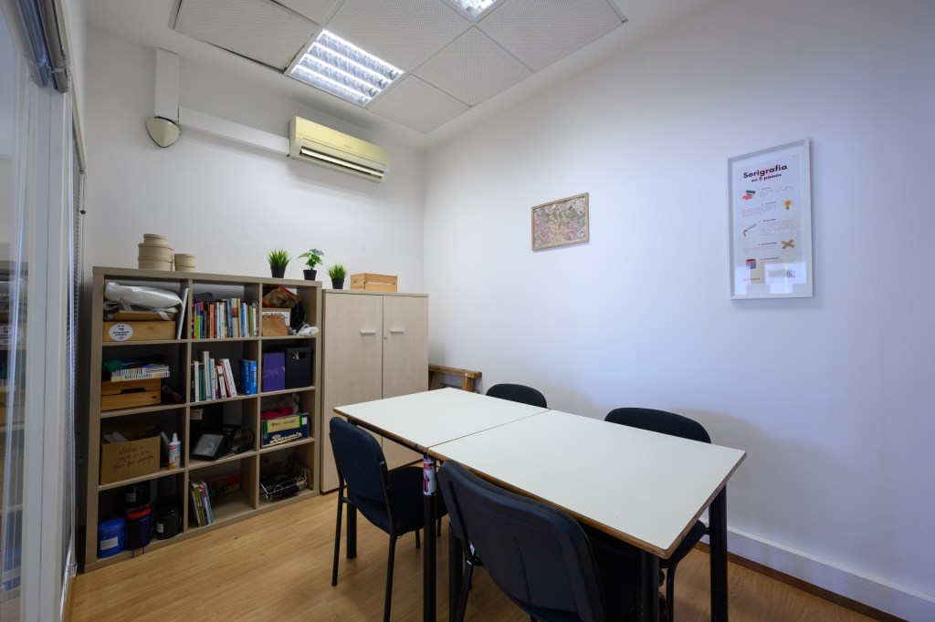 Equipada amb una televisió de 75″, taula de reunions, 20 tamborets, màquina de xapes, material de serigrafia, sofà, màquina de cafè i bullidora d’aigua.