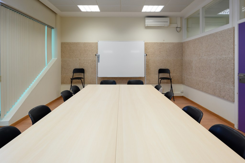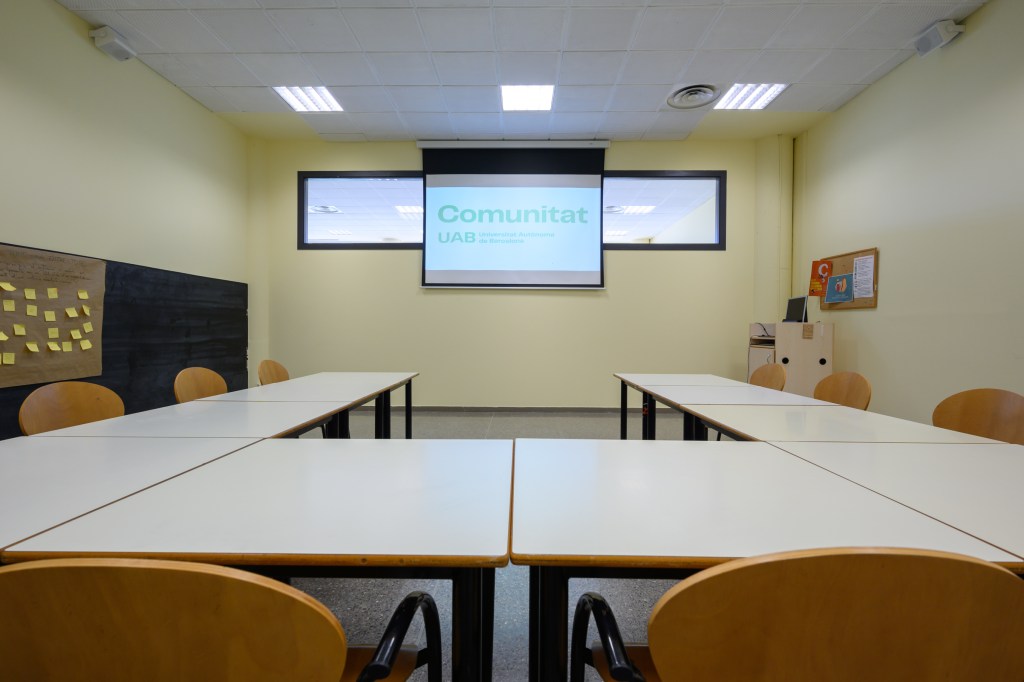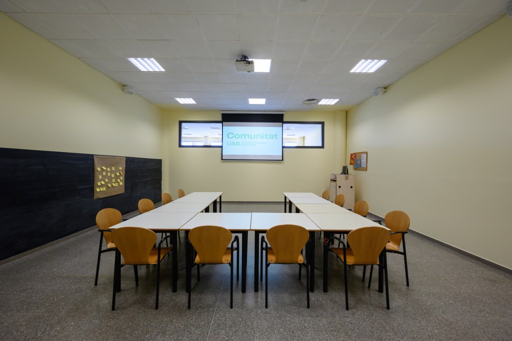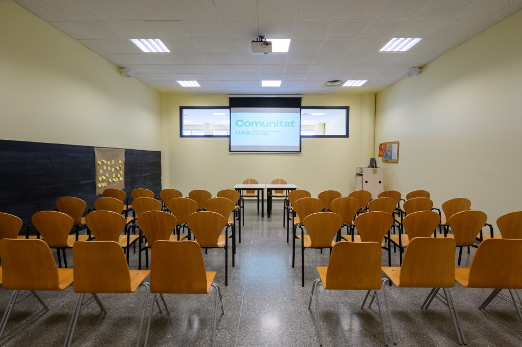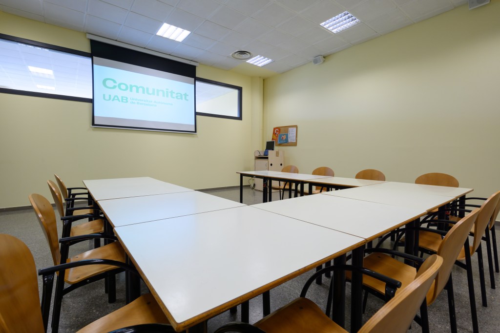 Sala de reunions equipada amb pissarra, projector i equip de so.
