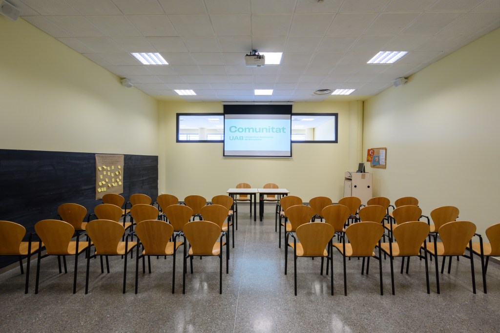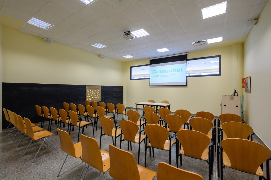 Sala d’actes d’ús polivalent que pot servir tant per reunions grans com per tallers, formacions, projeccions o xerrades. Està equipada amb projector, equip de so, ordinador i connexions necessàries per a endollar-hi equips propis.